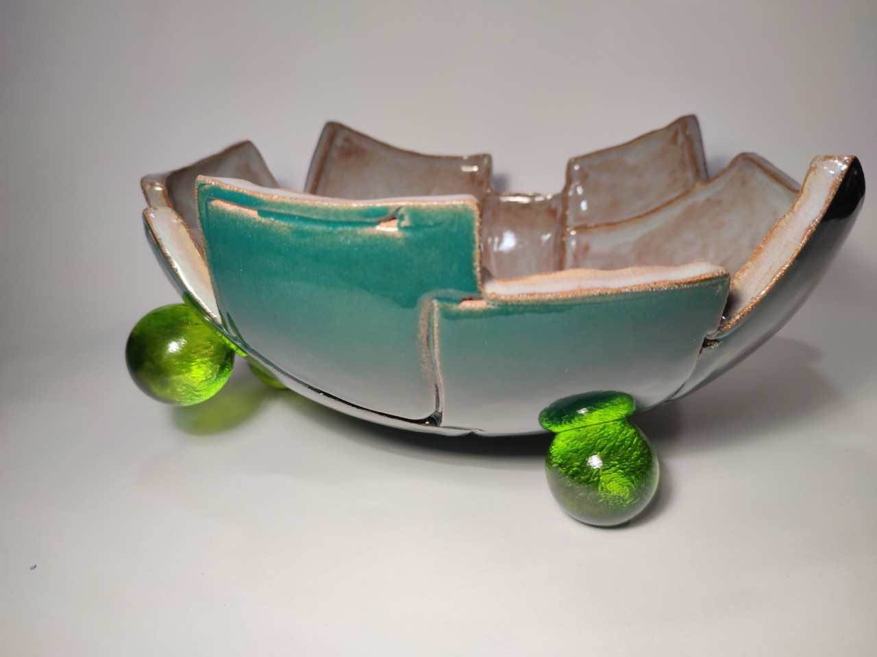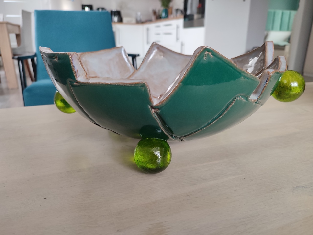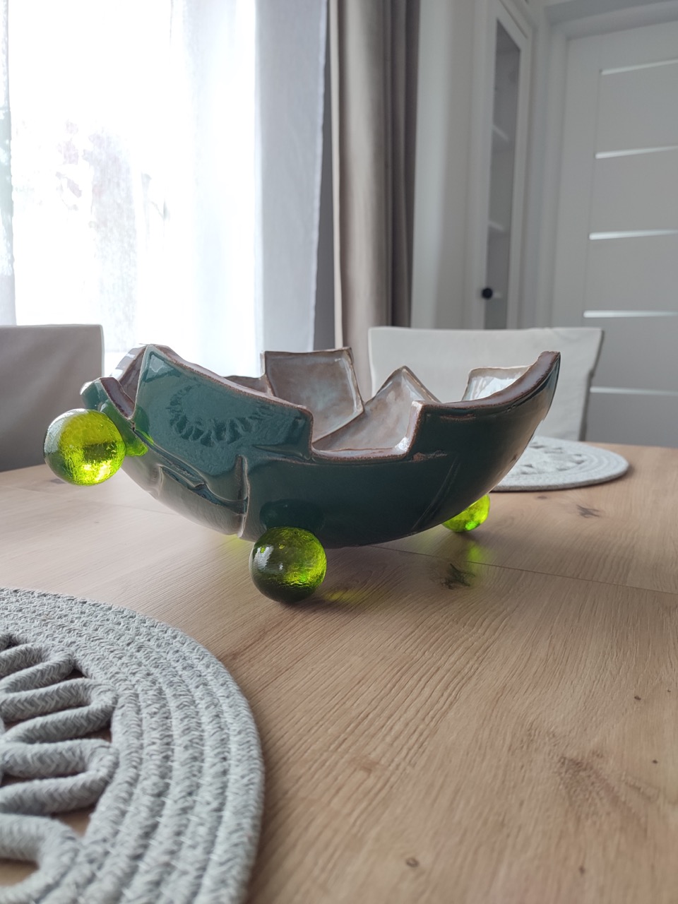 Forma „miski w kant” zainspirowana jest fałdą, kantem, niedoskonałością tkaniny – ale przekształcona w rzeźbiarską ceramikę. Głęboka, błyszcząca zieleń szkliwa na powierzchni, surowość czarnej gliny i jasnozielone kule ze szkła – niczym poranna rosa zatrzymana w doskonałej formie. To połączenie natury i nowoczesnego designu.