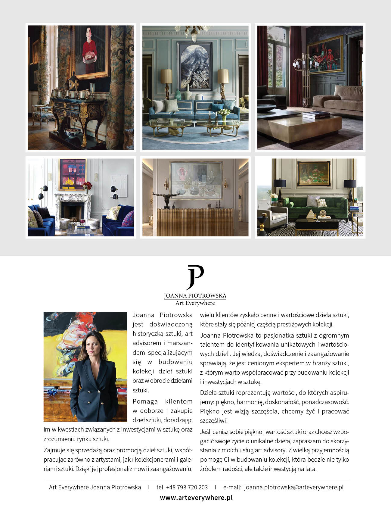 我是乔安娜·彼得罗夫斯卡(Joanna Piotrowska)。多年来,我身兼艺术顾问、艺术史学者、文化策略师和艺术经销商多重身份,致力于帮助客户畅游艺术世界——提供艺术品购藏建议、构建收藏体系、进行艺术品估值,并代表藏家与机构参与拍卖及展览。我始终坚信:艺术应当贴近生活——不仅存在于博物馆中,更应融入住宅、办公室、居所及商业空间。 作为华沙国家博物馆特邀大使及华沙现代艺术博物馆之友,我定期在LinkedIn领英、Instagram、Facebook、Twitter 等社交媒体及艺术门户网站www.art-everywhere.com分享专业见解。